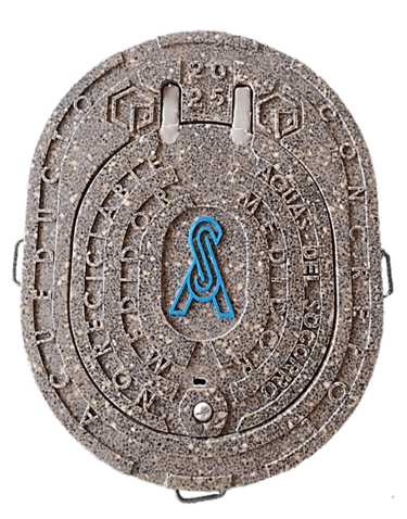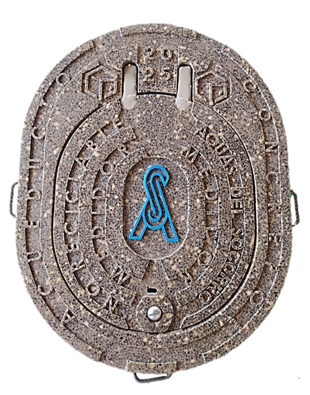 Tapa y marco en concreto polimérico para caja de registro de acueducto con el logo y el nombre del municipio, y con pasador de seguridad